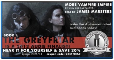 Buzzy Multimedia’s 10-disc unabridged audio production of Clay and Susan Griffith’s novel “Vampire Empire: The Greyfriar,” performed by James Marsters, has been nominated for the prestigious Audie Award in the Paranormal Audiobook category.