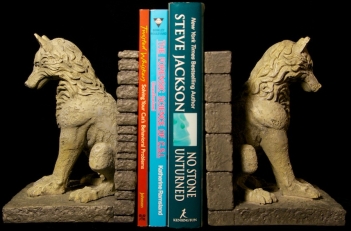 The direwolves are even nicer-looking than what’s depicted on the box or even my photos and they will appeal to any wolf collector, even non- Game of Thrones fans. At 6 pounds each, they are heavy enough to stop even oversize books from moving. The bookends dimensions are 7.25 x 5.5 x 5.75 inches, so they are tall enough for hardcovers or trade softcovers. While the bottoms are not fully felted, they do have little felted feet, which will prevent marring if you’ve got really nice wood shelves. Overall, one of the best-thought-out designs of the bookends I have and highly recommended.